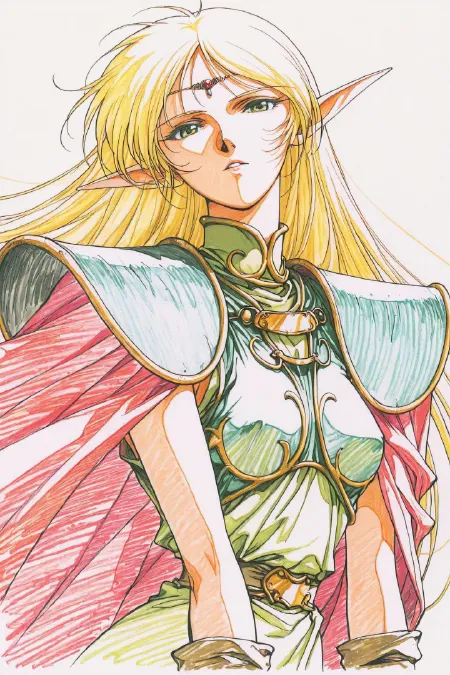 Colorful Line Art,1girl,Deedlit,solo,pointy ears,long hair,gloves,elf,cape,boots,circlet,very long hair,shoulder armor,parted lips,looking at viewer,white background,traditional media,upper body,