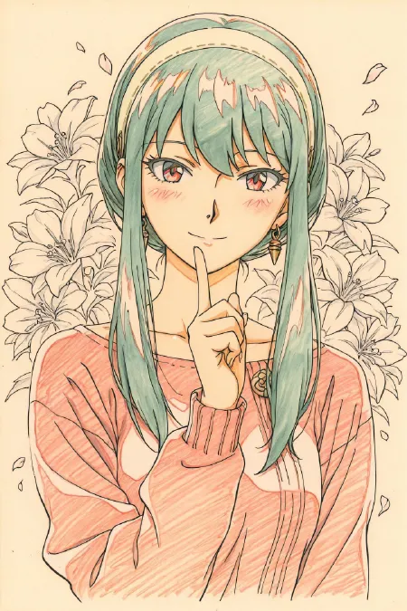 Colorful Line Art,1girl,yor briar,solo,flower,hairband,jewelry,earrings,sweater,smile,looking at viewer,upper body,petals,sidelocks,blush,long hair,long sleeves,closed mouth,traditional media,index finger raised,