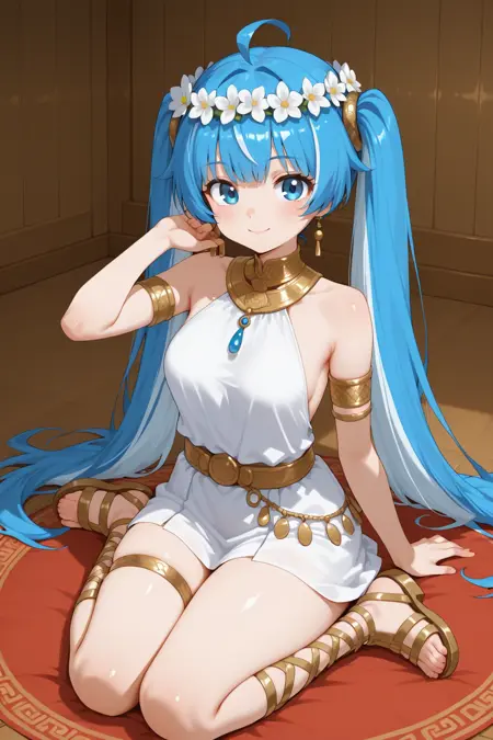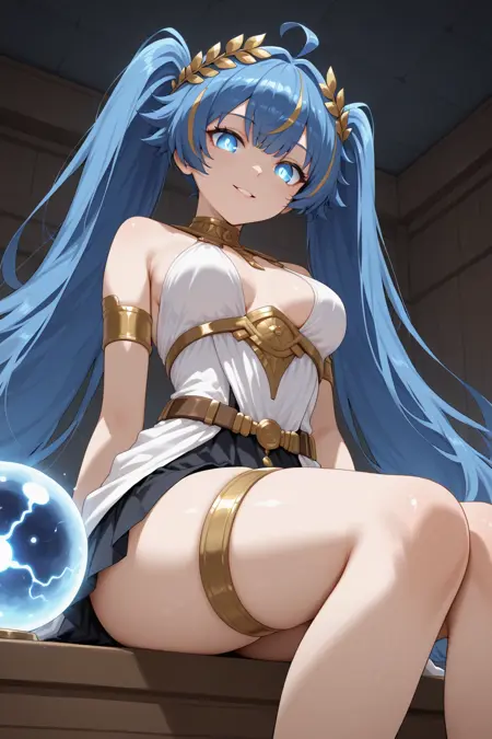 detailed_background,indoors,1girl,ahoge,ancient_greek_clothes,armlet,bare_shoulders,blue_eyes,blue_hair,breasts,closed_mouth,full_body,gladiator_sandals,greco-roman_clothes,hair_belt,hand_up,head_wreath,highres,iuno_\(wuthering_waves\),jewelry,long_hair,looking_at_viewer,medium_breasts,multicolored_hair,sandals,sitting,smile,solo,streaked_hair,tacet_mark_\(wuthering_waves\),thighlet,thighs,twintails,very_long_hair,wuthering_waves,zhanzhan_lan