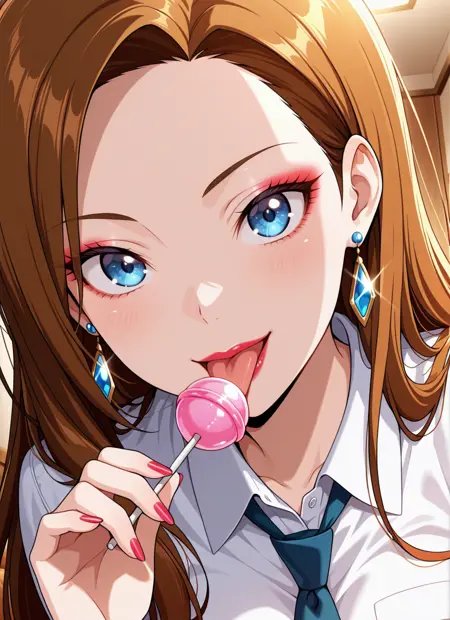 1girl, karen hojyo, long hair, jewelry, earrings, brown hair, makeup, lipstick, blue eyes, necktie, looking at viewer, smile, licking lollipop, in apartment, close-up,, <BREAK> masterpiece, best quality, absurdres, highres, very aesthetic, high quality, detailed, insanely detailed, , anime screencap, (vivid:1.2),(extreme-detailed), cute face, clear skin , shiny hair, beautiful eyes