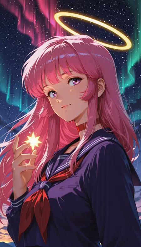 masterpiece, best quality, amazing quality, 4k, very aesthetic, high resolution, ultra-detailed, absurdres, newest, scenery, 1980s_\(style\), 1990s_\(style\), faux traditional media, 1girl, solo, cute, pink hair, long hair, big hair, choppy bangs, long sidelocks, nebulae cosmic purple eyes, rimlit eyes, facing to the side, looking at viewer, downturned eyes, light smile, red annular solar eclipse halo, red choker, detailed purple serafuku, big red neckerchief, (glowing stars in hand:1.2), fingers, arched back, from side, from below, dutch angle, portrait, upper body, head tilt, colorful, rim light, backlit, (colorful light particles:1.2), cosmic sky, aurora, chaos, perfect night, fantasy background, BREAK, detailed background, blurry foreground, bokeh, depth of field, volumetric lighting