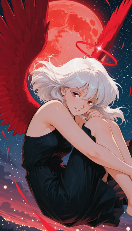 masterpiece, best quality, amazing quality, 4k, very aesthetic, high resolution, ultra-detailed, absurdres, newest, scenery, 1980s_\(style\), 1990s_\(style\), faux traditional media, 1girl, solo, red halo, long white hair, hair between eyes, floating hair, red eyes, turning head, looking at viewer, white eyelashes, raised inner eyebrows, smile, parted lips, black sundress, circle skirt, red angel wings, floating, (midair:1.2), knees up, hugging own legs, arched back, from side, dutch angle, portrait, upper body, night, starry sky, red full moon, dark, omnious, BREAK, backlighting, luminous particles, shimmering feathers, subtle lens flare, cinematic lighting, depth of field, bokeh, volumetric lighting, dreamy atmosphere