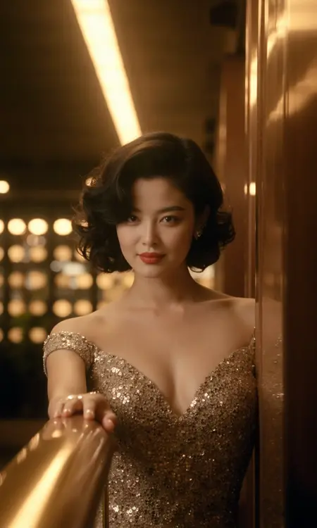 POV, A woman with short, dark, wavy hair is leaning over a railing. She is wearing a shimmering, sequined dress with an exposed shoulder design. The background features warm, out-of-focus golden lights, suggesting an elegant indoor setting. The scene conveys a luxurious and cinematic atmosphere.