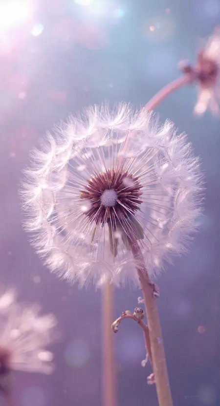 central composition: translucent dandelion seeds mid-transformation