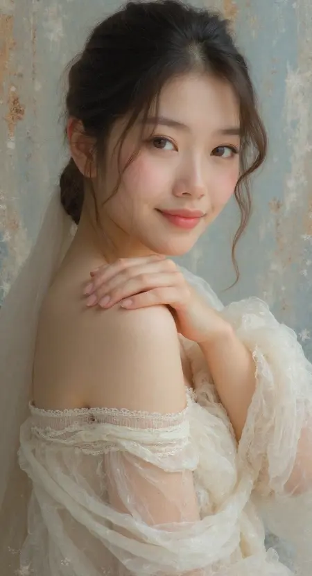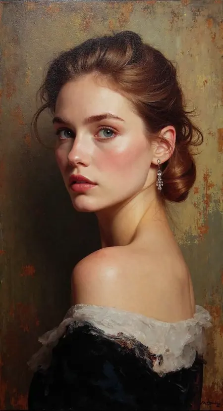 (Full body Oil Painting. Artwork style of Karol Bąk: 2.0) A beautiful young woman. Captivating expression.