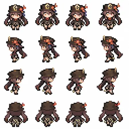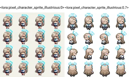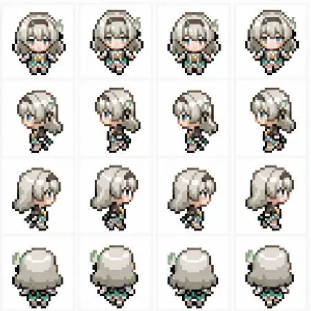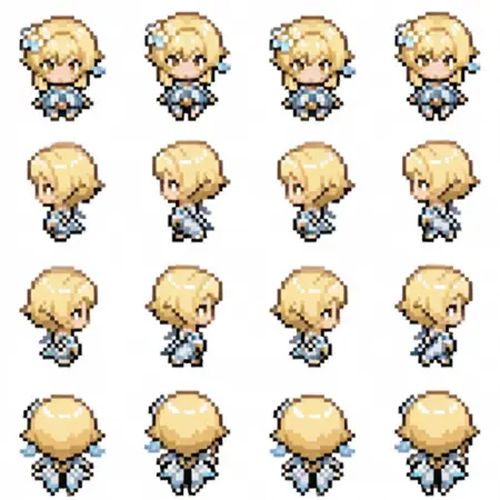 触发词: | pixel_character_sprite, pxlchrctrsprt, sprite, sprite sheet, sprite art, pixel, (pixel art:1.5), retro game, retro, vibrant colors, pixelated, multiple views, concept art, (chibi:1.5), from side, looking away, from behind, back, white background, |