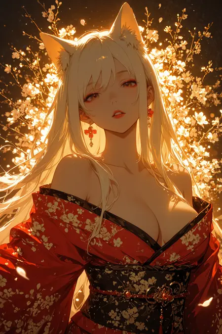 ,1girl, (lamb-oic029:0.44), (alzi xiaomi:1.1), (koujuan:1.1), (ohisashiburi:0.9), Masterpiece, amazing quality, 8k, ultra detailed, refined details, high resolution, HD, masterwork, digital illustration, LDSCH, 7481llu, solo, dynamic pose, dynamic angle, cat ears, cinematic composition, mountains bathed in golden light, fields of blooming lilies stretching below, sky painted with glowing cloudsshoulder free, kimono, red kimono, obi, sash, colorful, cleavage, japanese clothes, jewelry, upper body, long hair, parted lips, looking at viewer, earrings, collarbone, white hair, floral print, cherry blossoms, off shoulder, bare shoulders, medium breasts, animal ear fluff, lips, extra ears, brown eyes, large breasts, petals