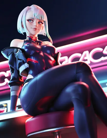 lucy \(cyberpunk\), 1girl, solo, pale_skin, crossed legs,light_smile, glow in the dark ,sitting at the bar counter, from_below, dark night, neon_lights, cocktail_glass, smile, from below, dynamic pose, sky, rooftop, curvy, skindentation, pink theme, pantyhose, ass, looking afar, smile, open jacket, bare shoulders,