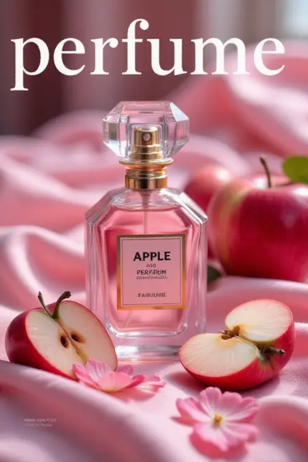 Magazine cover.Magazine book cover.text title "perfume"in artly bold font displayed on the top,potret of a translucent oval bottle perfume made from red apple smell aroma with some apple fruit and apple picture on a label of bottle,A slice near by,on the pink silk bedspread,with pink roses petal around,Macro shot style coax_ai,Chibi cyberpunk style coax_ai,Magazine Cover-Ai_Coax