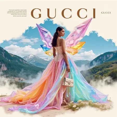 magazine_style, magazine cover, cover of Gucci fashion magazine, text "Gucci" behind the scene, a dreamy, abstract mountain landscape in vibrant watercolors as background, a fairy-like woman with wings made of crystal, wearing a flowing, iridescent Gucci gown that sparkles like gemstones, showcasing ethereal beauty.