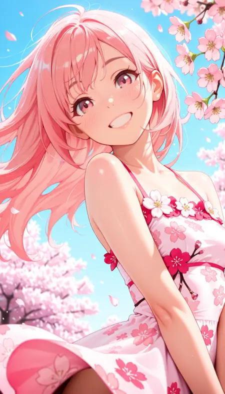 dusk,sunset,against backlight at dusk,golden hour lighting,flower background,in spring,cherry_blossoms,pink hair,1girl,adult,curvy,flower decoration,pink slingshot_swimsuit,lace,dynamic pose,dynamic_angle,head_tilt,looking_at_viewer,leaning_forward,smile,