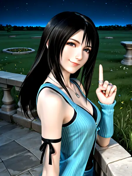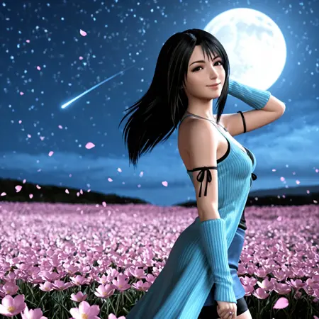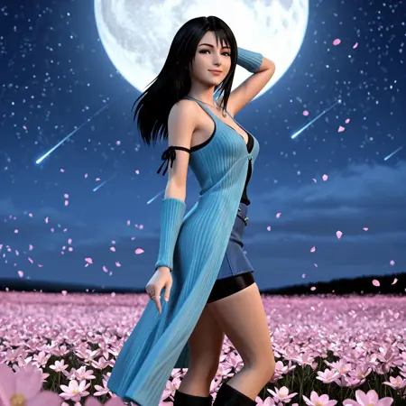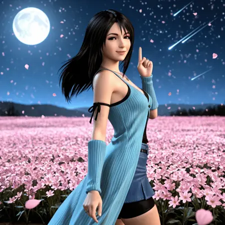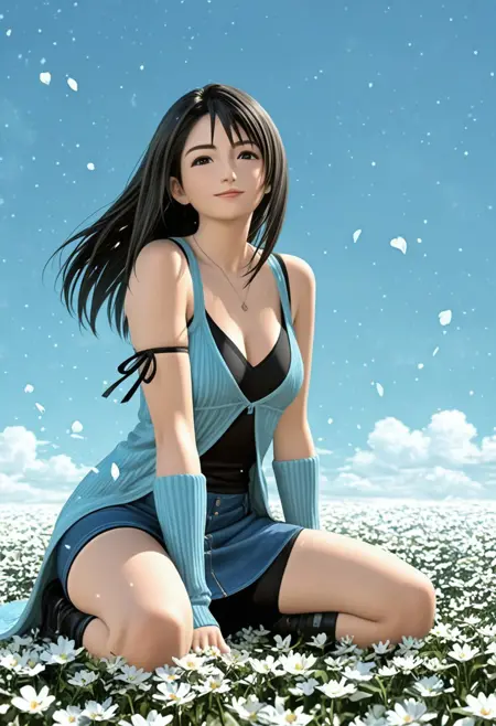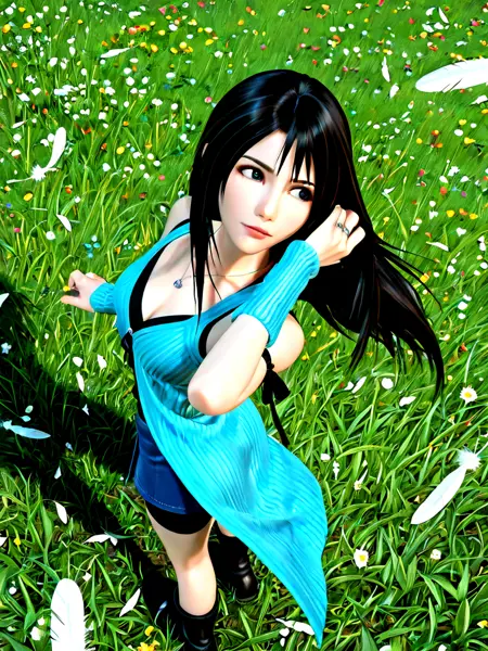 触发词: | rinoa heartilly, 1girl, lips, black eyes, black hair, long hair, ring necklace, cleavage, breasts, sleeveless coat, sleeveless duster, black undershirt, arm warmers, arm ribbon, blue miniskirt, blue skirt, bike shorts under skirt, black shorts, black boots, wind, index finger raised, looking at viewer, from side, falling feathers, white feathers, grass, sky, falling petals, pink petals, flower field, sky, seductive smile, |