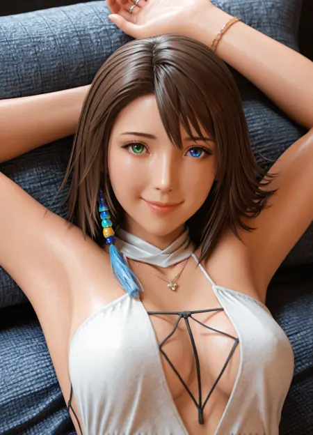 Yuna112, 1girl, solo, jewelry, brown hair, ring, lying, necklace, hair ornament, breasts, armpits, heterochromia, smile, realistic, on back, upper body,