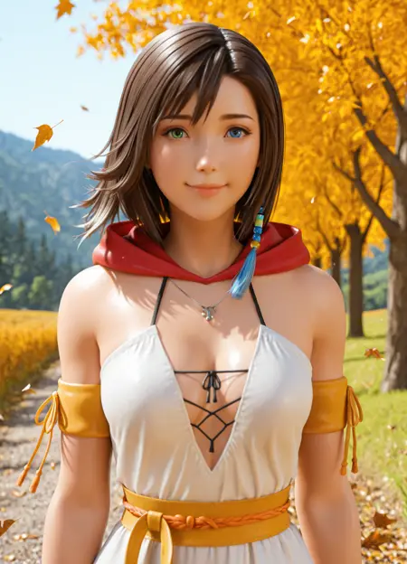 Yuna112, brown hair, nose, lips, happy, short hair, wind, leaves, white dress, cleavage, outdoors, hair ornament, armband, yellow belt, red hood, hood down,