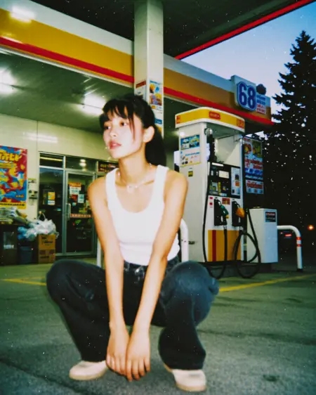 The tile roof of the gas station casts a thick shadow downwards, creating jagged light - and - dark stripes on the concrete. Through the dusty glass, a faint yellow light can be seen coming from the gas station's service booth, but there is no one inside. In the background, a vending machine with an old Pepsi logo hums at night, and next to it stands a sign with a no - smoking sign drawn on it.