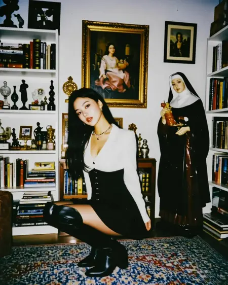 She is wearing a pink top with a ruffled collar, and the overall style is cute and full of a girlish charm. The background is an indoor environment that looks like a bookstore. There are some brightly - colored books on the shelves, and the warm lighting creates a cozy atmosphere. Although the background is blurry, the outlines of the shelves and books can be recognized, indicating that this is a place full of the flavor of life.
