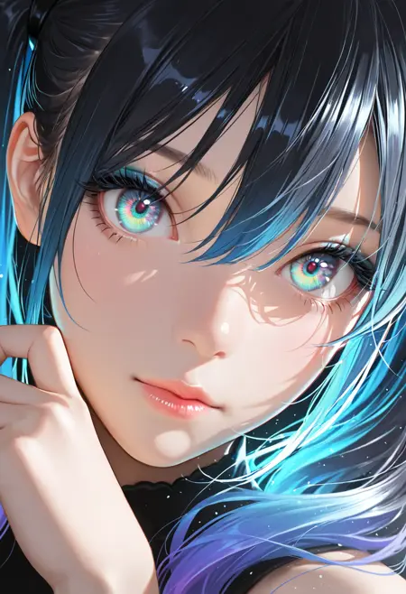 solo, looking at viewer, multicolored eyes, portrait, blue hair, lips, eyelashes, makeup, black hair, cyan hair, gradient hair, multicolored hair, hair between eyes, close-up, hand up, eye focus, glowing, long hair, closed mouth, gradient hair, (twintails:1.2), glow in the dark, masterwork, masterpiece, best quality, dynamic lighting , dynamic pose,, dynamic angle, (realistic:1.2), (lineless:1.2), detailed, beautiful color, detailed, amazing quality,light particles,lens flare,light rays
