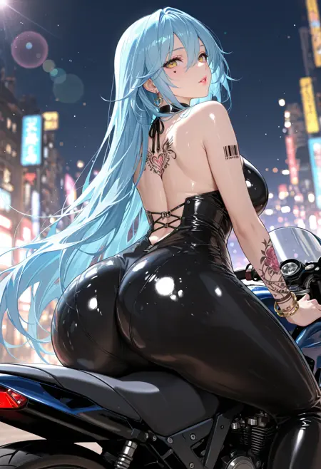 tattoo, breasts, ass, ass focus, jewelry, long hair, solo, motor vehicle, motorcycle, earrings, looking at viewer, looking back, yellow eyes, blue hair, from behind, parted lips, barcode tattoo, blurry background, arm tattoo, blurry, heart, back tattoo, heart tattoo, outdoors, large breasts, back, night, bracelet, piercing, very long hair,halter bodysuit, shiny skin, lips, hair between eyes, barcode,