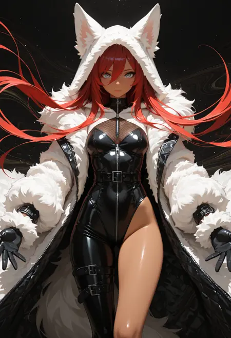 ((Best Quality)) (masterpiece) (details), 1girl, solo,glowing neon purple eyes,face focus,,iridescent lips, neon purple, holographic, metallic, bold colors, stylized, abstract, surreal, shiny,face focus,full face,eyeshadow,eyeliner,eyelashes,smug,huge breasts,bodysuit,cowboy_shot,floating fur coat, dynamic angle, asymmetrical legwear, belts, ribbons, leather, brown, fluffy accents, fluffly gloves, hood,