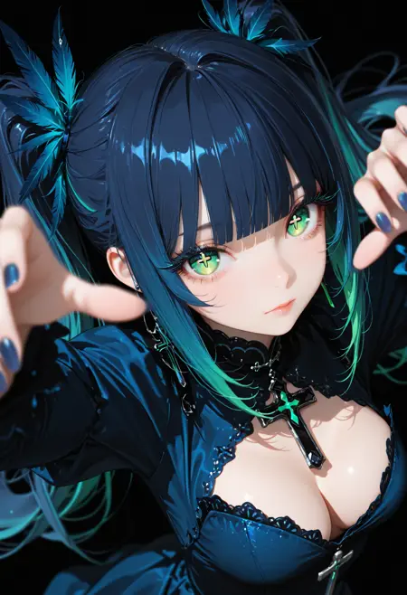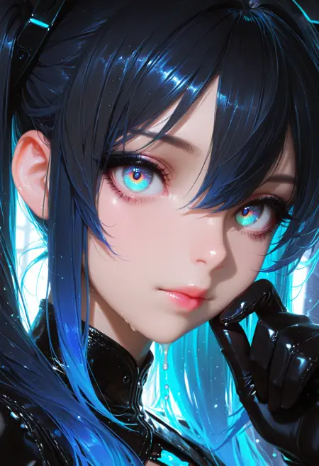 solo, looking at viewer, multicolored eyes, portrait, blue hair, lips, , dripping, eyelashes, makeup,black leather gloves, black hair, cyan hair, gradient hair, multicolored hair, hair between eyes, close-up, hand up, , eye focus, glowing, long hair, closed mouth,close-up,gradient hair, twintails, glow in the dark, masterwork, masterpiece, best quality, dynamic lighting , dynamic pose,, dynamic angle, (realistic:1.2), (lineless:1.2), detailed, beautiful color, detailed, amazing quality,light particles,lens flare,light rays