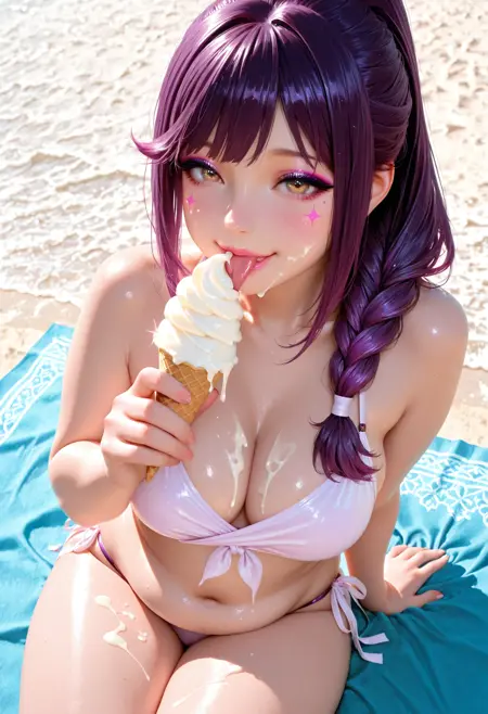 A plump cutie lounges on a beach towel, licking melting ice cream as it drips down her fingers. Her purple hair is tied in a loose braid, framing her flushed cheeks. Hazel eyes glimmer beneath sparkly eyeshadow. Glossy pink lips wrap around the cone as she arches her soft belly forward, giving a teasing smile sweet enough to melt in the sun.