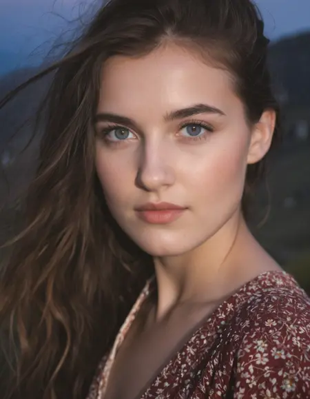 fine art portrait photography, kodak portra, f-stop 1, evokes classy sass, facial portrait close up, macro skin details, portrait of a beautiful 20 year old basque woman, face focus, wild long hair, flamboyant elegance Pyrenees style, sensational realism, out of focus background: French basque mountain trail overlooking rustic stone cottages, realistic skin, goosebumps, background faintly seen, each layer of depth achieved in degrees of focus and saturation, pauper couture, wearing traditional basque blouse off one shoulder, photographic art by (tony kelly:0.9) and (steve henderson:0.4), stylized, dramatic lighting, vignette, ambient light, dim dramatic dusk, blush, emotional eyes shine, dramatic lighting, romanticized, beautiful and stunning, innocent and sly, classy, prim, fantasy, natural materials, ultra realistic, faded realism, (dynamic chromatic range) via cinematic color style, (face focus), sfw