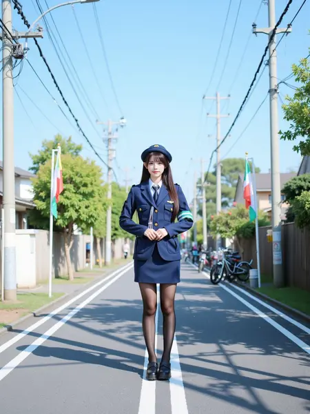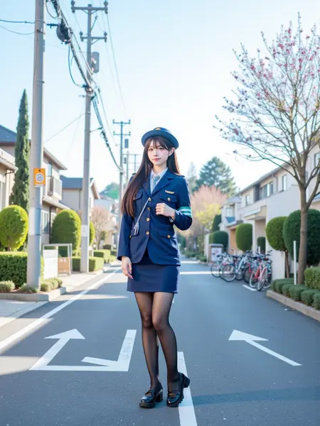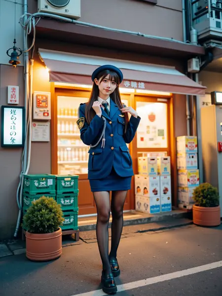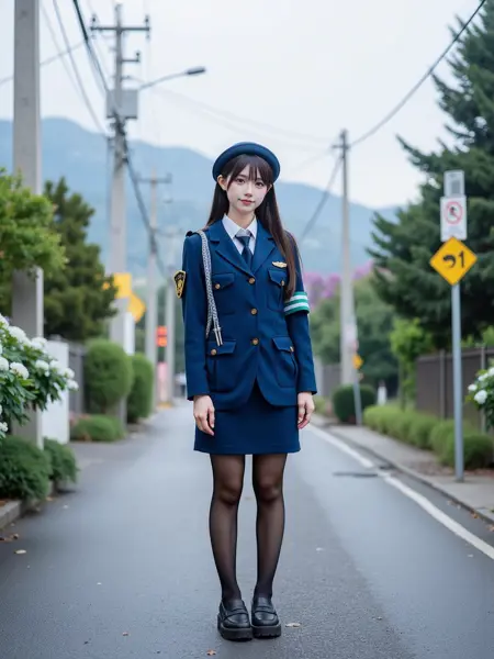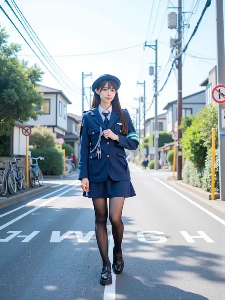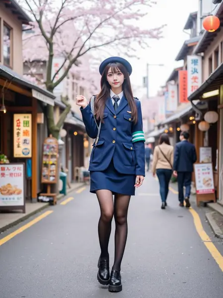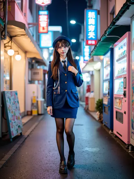 | 触发词: | A realistic photo of a slender beautiful young woman in cyb-mikinakano cosplay costume. She is also wearing tie and black pantyhose and black loafers. She has long brown hair with hat. |