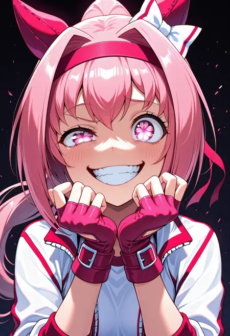 masterpiece,best quality,amazing quality, absurdres, <lora:gesugao_ilxl_goofy:1> gesugao, 1girl, green scarf, pink hair, red eyes, fangs, long hair, pink bow, looking at viewer, open mouth, crazy smile, low twintails, long sleeves, upper body, red background, pink bowtie, pink sailor collar, hands up, blunt bangs, teeth, uneven eyes, white jacket, evil smile, breasts