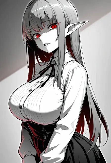 masterpiece,best quality,amazing quality, absurdres, <lora:gesugao_ilxl_goofy:1> gesugao, 1girl, pointy ears, large breasts, long hair, virgin killer outfit, red eyes, spot color, monochrome, looking at viewer, long sleeves, skirt, parted lips, shirt, slit pupils, sidelocks