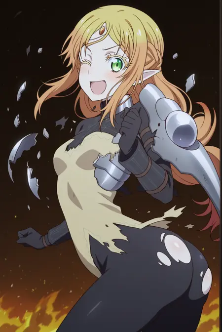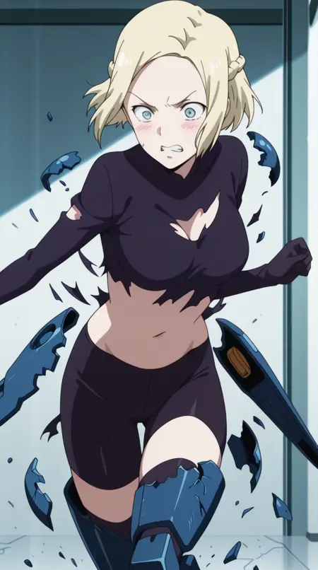 masterpiece, best quality, amazing quality,, <lora:akira-mado-s2-illustriousxl-lora-nochekaiser:1>, akira mado, short hair, blonde hair, braid, blue eyes, french braid, mature female, medium breasts, anime screencap, <lora:broken-armor-illustriousxl-lora-nochekaiser:1>, broken armor, exploding clothes, solo, looking at viewer, blush, thighhighs, navel, teeth, torn clothes, bodysuit, clenched teeth, bike shorts, mecha musume, ,