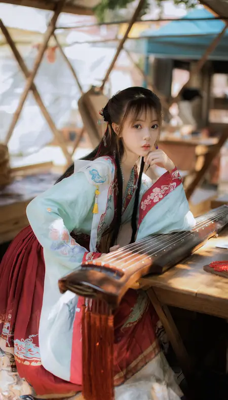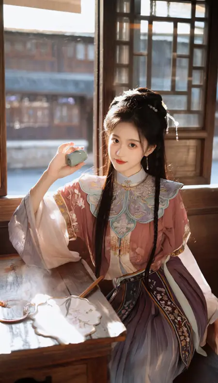 白天古街酒肆,阳光透过木窗洒下柔和光晕,晕染在木质酒桌上,桌上散落一串珊瑚珠链,珠子泛着柔和光泽。姑娘优雅地端坐酒桌旁,手持陶瓷酒杯轻品,穿明制汉服:浅红色对襟短衫,宽袖绣着祥云纹样,深紫马面裙褶边规整,绣有梅花,配以淡蓝云肩,绣金流su垂落。她一手持酒杯,杯壁青釉闪光,另一手轻抚腰侧的鎏金流su,流su垂落腰间。她的长发披散,斜插一枚白玉发簪,簪头垂珠轻晃。表情娇媚挑逗,眼睛透过酒杯斜视观众,瞳孔如晴空清澈,睫毛低垂如柳,唇瓣涂着樱红胭脂,微微上扬,透出优雅的诱惑笑意。她端坐微倾,腰肢柔软,马面裙的褶边勾勒出腿部的流畅弧线。酒桌旁放一柄折扇,扇面绣着兰花。微风吹动云肩,木桌上的光影交错。色调柔和如阳光的暖光,清透得能看清发簪的细珠纹理和裙摆的细腻光影,高清32k。