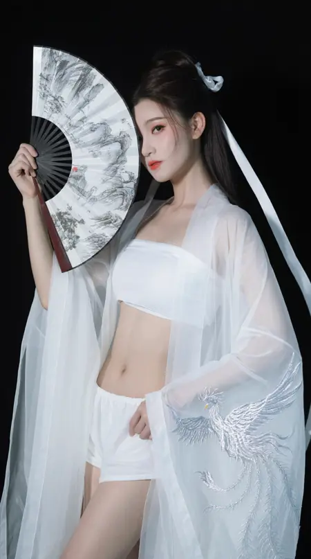 她身着一件白色的透明仙侠长袍,长袍内穿着一件白色的抹胸和白色的短裤,肌肤若隐若现。长袍的袖口和衣摆处绣着银色的凤凰图案,凤凰展翅欲飞,仿佛要从衣服上跃出。她的头发用一根白色的丝带束起,丝带的两端垂在背后。她手持一把银色的折扇,折扇上画着美丽的风景,她轻轻打开折扇,遮住半张脸,只露出一双勾人的眼睛。