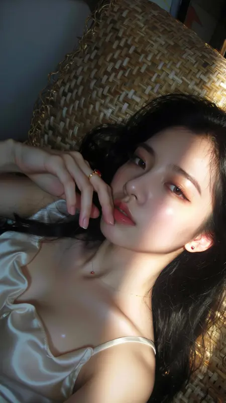 白天小茅屋庭院,阳光洒下金色光晕,晕染在竹编椅子上,背景茅屋古朴宁静。姑娘优雅地半坐于竹椅,手持书卷轻阅,穿明制汉服:淡蓝色对襟短衫,宽袖绣着祥云纹样,浅红马面裙褶边规整,绣有梅花,配以白色云肩,绣金流su垂落。她一手持书卷,目光流转,另一手轻抚竹椅纹理,感受竹子凉爽触感。她的长发披散,斜插一枚白玉发簪,簪头在阳光下轻晃。表情魅惑挑逗,眼睛透过书卷半眯斜视观众,瞳孔映着阳光微光,透出调侃挑逗的明媚目光,唇瓣涂着樱红胭脂,微微上扬,似在低语般透出诱惑笑意。她半坐微倾,腰肢柔软,马面裙褶边勾勒腿部流畅线条。书卷局部特写突出手指轻翻页边的细腻动作,营造宁静诗意。身旁放一柄折扇,扇面绣着兰花,与汉服协调。微风吹动云肩,庭院背景的光影交错,书香缭绕。色调柔和如阳光暖光,清透得能看清发簪细珠纹理和裙摆细腻光影,高清32k.