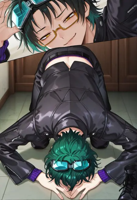 masterpiece,best quality,newest,high resolution,very aesthetic,absurdres,professional,high-quality, anime coloring, indoors, dogeza, prostration, all fours, bowing, smug, half-closed eyes, (head down, face down:1.8), Full-body view and facial close-up view, sha_min\(gnosia\),1boy, male focus, black hair, short hair, green hair, goggles on head,yellow eyes,multicolored hair,black leather jacket, long sleeves, glasses, semi-rimless eyewear, belt, midriff peek, black pants,boots, black cross-laced footwear,