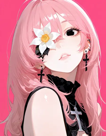masterpiece, best quality,high quality, newest, highres,8K,HDR,absurdres, <lora:mms_1suu_style-000010:1>,mms_1suu_illu,flower, jewelry, 1girl, solo, earrings, cross, pink background, pink hair, one eye covered, looking at viewer, simple background, white flower, piercing, yellow flower, black eyes, foreshortening,