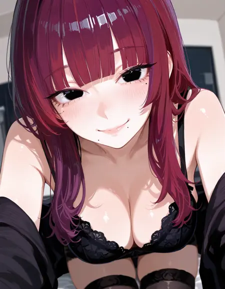 masterpiece, best quality,high quality, newest, highres,8K,HDR,absurdres, <lora:mms_1suu_style-000010:1>,mms_1suu_illu, 1girl, mole, solo, red hair, mole under mouth, thighhighs, long hair, smile, looking at viewer, breasts, blush, shirt, bangs, black thighhighs, black eyes, black shirt, large breasts, mole under eye,black bra, blunt bangs, purple hair, hands up, bare shoulders,depth of field, foreshortening,