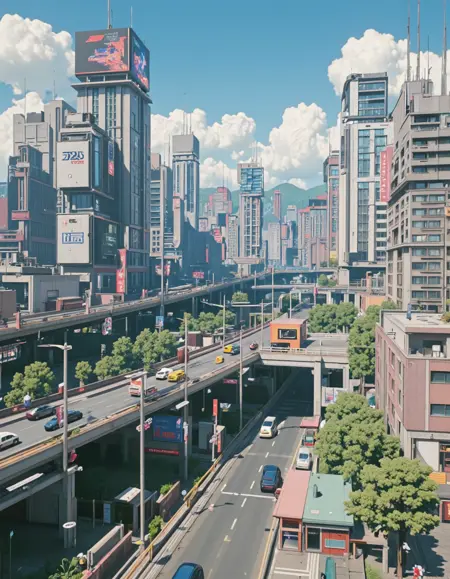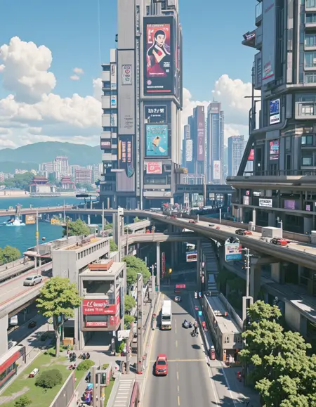 <lora:training_2617621-20251204085747005:1> citybkg, ghibli style, cyberpunk, day, sunny, clouds, detailed, street, traffic, futuristic, elevated highway, front aerial view, high buildings, low buildings, buildings under highway, billboard over building, billboard on building, tunnels, electric poles, vegetation, trees, signs, shop under highway, street shop, phot9, epic scale, sea, asian temple, beach, waves, woman in red , dress