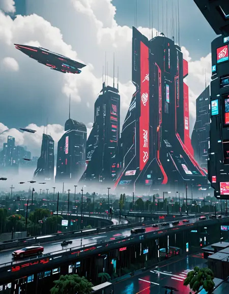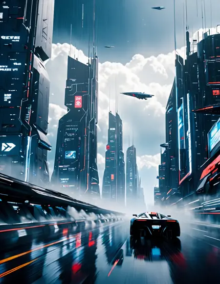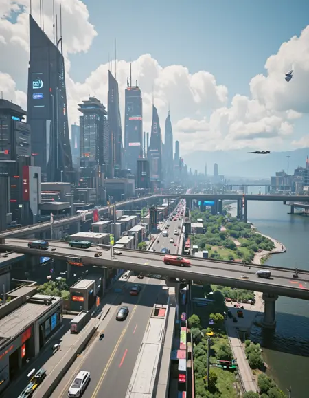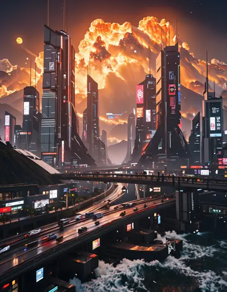 <lora:training_2617621-20251204085747005:1> photo, ambiance, city lights, citybkg, clouds, cyberpunk, day, detailed, elevated highway, epic scale, fantasy, fire sky, cyberpunk metropolis, front view, futuristic, high buildings, low buildings, marble, massive design buildings, mountains, night, orange clouds, phot30, rough sea, waves, scenery, shiny diamonds, shop signs, street, sunny, wet, white, cars, traffic,