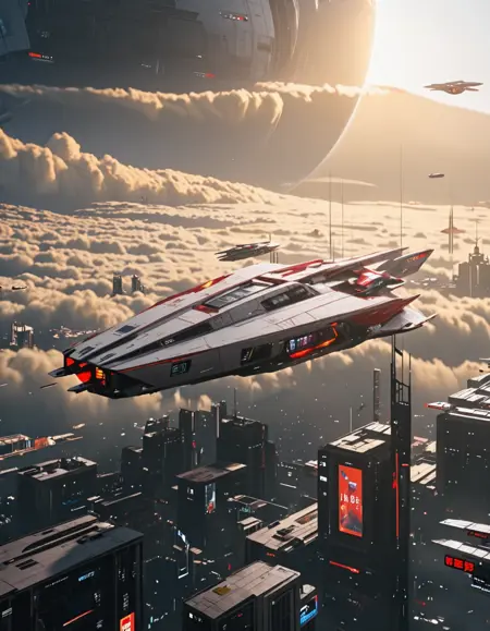 Ahead, a sprawling futuristic skyline rises against the storm-filled horizon. Towering skyscrapers pierce the clouds, their glass surfaces shimmering with cold reflections from the early evening light. A single tall spire glows with a bright pink beacon, cutting sharply through the haze like a flare guiding travelers into the city. Smaller aircraft hover faintly in the distance, their lights blinking as they weave through the brooding sky.