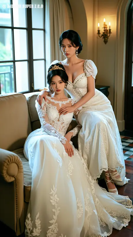 z-turbo, 全身像,8K超高清,影视级写实画质,极致细腻无噪点,居家或酒店房间环境,暖色墙面,简约装饰画背景,两名22-28岁时尚靓丽东亚女子亲密暧昧互动: