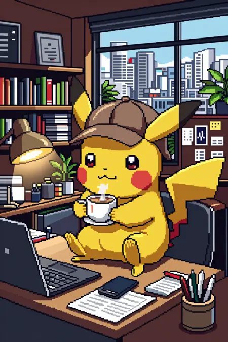 aziib_pixel_style, Pikachu sitting on top of a modern office desk, single tail clearly visible, holding a small cup of hot coffee with both paws, gentle steam rising from the cup. Pikachu is wearing a classic brown deerstalker hat, slightly oversized, giving a detective-like appearance, expressive eyes focused forward, calm and curious mood.