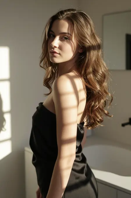 A beautiful young woman with flawless anatomy poses with poised elegance wearing a rose pink silk chemise with a delicate lace neckline, her refined posture and serene expression framed within an opulent baroque interior of gilded mirrors, flickering candlelight, crystal chandelier glows, dark floral wallpaper, and heavy velvet drapes, captured through a medium format lens with an analog film aesthetic that reveals fine skin texture and intricate fabric detail, soft golden highlights caressing her features to create a hyperreal composition rich in warmth, intimacy, and dramatic baroque atmosphere