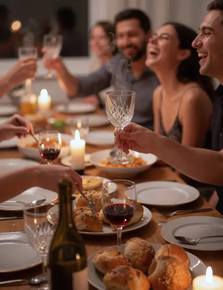 A candid, slightly blurred moment captures the warmth of a bustling dinner partyâcrowded around a long wooden table where plates overflow with rich textures:golden crusts, steaming sauces, red wine glistening on porcelain. The focus sharpens dramatically on one person mid-laugh, head thrown back in full, unguarded joy, eyes closed and cheeks flushed as they clench the rim of a crystal wine glassâits surface reflecting the dim overhead light with a soft, fractured glow. Their expression is pure, unrestrained:lips parted, shoulders shaking, fingers curled slightly around the stem as if holding onto something sacred. Behind them, friends lean in with half-smiles or raised glasses, their silhouettes softened into dreamy bokehâblurred faces caught in gentle haze, dishes scattered like fragments of a shared moment. The background pulses with ambient warmth:candlelight flickers through the edges, golden reflections dance across tableware, and steam rises from a bowl of pasta like ghostly breath. The camera captures a natural imperfectionâthe slight blur of motion, the soft focus on hands reaching for forks, the way light catches in a spoon or a napkin. Shot with a 50mm f/1.4 lens, the depth of field isolates the emotional center while preserving rich atmospheric detailâevery grain of bread, every ripple in wine, every flicker of emotion rendered in cinematic clarity. This isnât just laughterâitâs release, connection, and the quiet magic of shared joy unfolding in real time, preserved not with perfection but with truth.