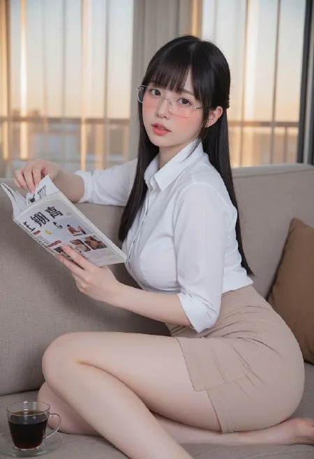 姿势:蹲在货架前挑选酸奶,双腿大大分开保持平衡。右手扶着货架,左手拉着裙侧拉链。身体前倾,西装外套向两侧滑开,吊带无法完全遮盖胸部,乳沟深陷。抬头看向货架上方,眼神迷茫。