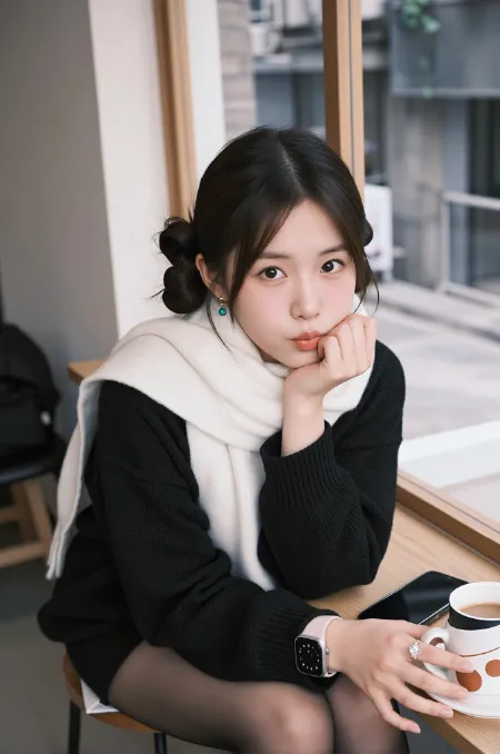 配饰:颈部有细长珍珠项链,滑入衣领深处。左手腕戴皮质表带手表,右手无名指有戒痕。