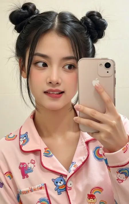 biting lip, a gigapixel high resolution photo of a Korean K-Pop star with her hair in two tight buns on the top of her head taking a selfie with her iphone while in front of her bathroom mirror seductively biting her lip in sexual arousal as she looks at the viewer, she is looking at the camera, she is looking at the viewer, detailed skin, her eyes are gazing and focused at the center middle of the frame making direct eye contact with the viewer, she is wearing a comfy pink cotton onesie with rainbows and cats and unicorns printed on them, focus stacking, sexy biting lip