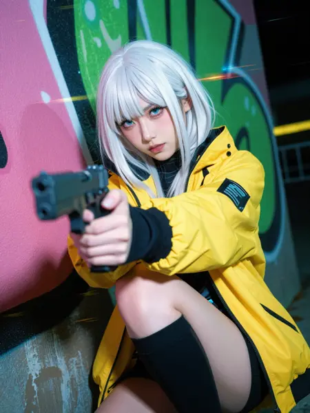 long face, long eyelashes, sideways glance, serious expression, white hair, hime cut, yellow jacket, cyberpunk, tech wear, holding gun with one hand, aiming at viewer, knee up, pink and green neon colored graffiti wall, night, sitting by wall. view from side, (glitch), dynamic composition, dynamic angle. foreshortening.