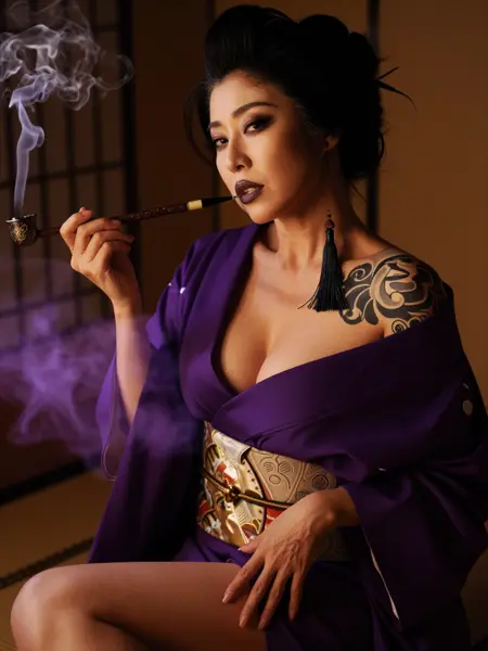 mature female, long face, long eyelashes, wrinkle skin, bitch, oiran, narrowed eyes, thick lips, pout lips, expressionless, sideways glance at viewer. long eyes, eyeshadow. updo hair. deep cleavage, perfect hands, large japanese style tattoo. wearing a purple kimono, bare shoulder, tassel. holding kiseru, smoke from Japanese smoking pipe. sitting on side, wide hip, perfect hands, dark, warm lighting, purple smoke in blurry foreground. view from side, cowboy shot, dynamic composition, dynamic angle. Japanese room