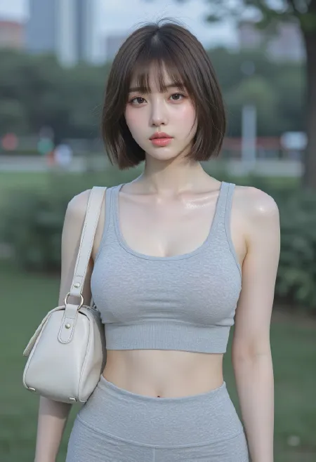 1girl,solo,asian woman,Japanese idol face,smooth and fair skin,long ombre brown hair,straight hair, Bangs,curvy,perfect female body, slender legs, toned legs with curves,gigantic breasts. Her messy soft short hair with light backlighting the strands, ethereal expression, glowing skin,striking brown eyes.