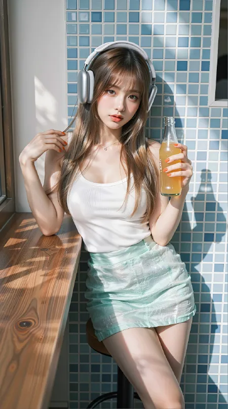 She is leaning against a wall featuring pale blue square mosaic tiles.She is holding an icy glass bottle of orange soda in one hand and close to her face. The setting is a bright, sun-drenched retro Japanese cafe. A warm dark walnut wooden counter is visible in the foreground. Dappled sunlight and leaf shadows are cast onto the tiles.